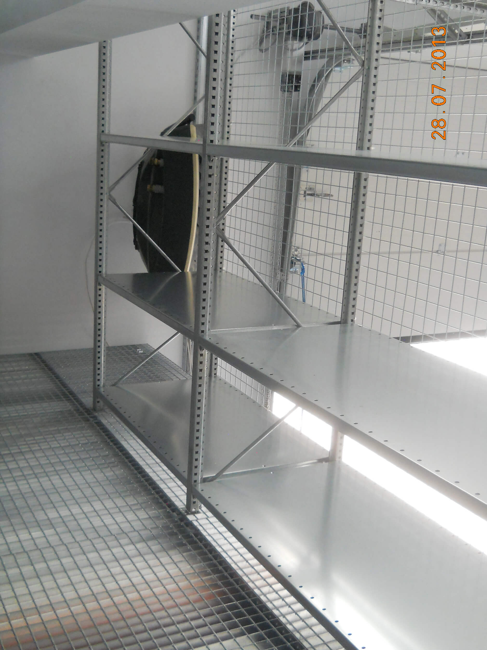 Konstrukcję tworzą mocne stalowe profile, wypełnione siatką i wykończone zaczepami, które służą do zamontowania jej do ramy regału.