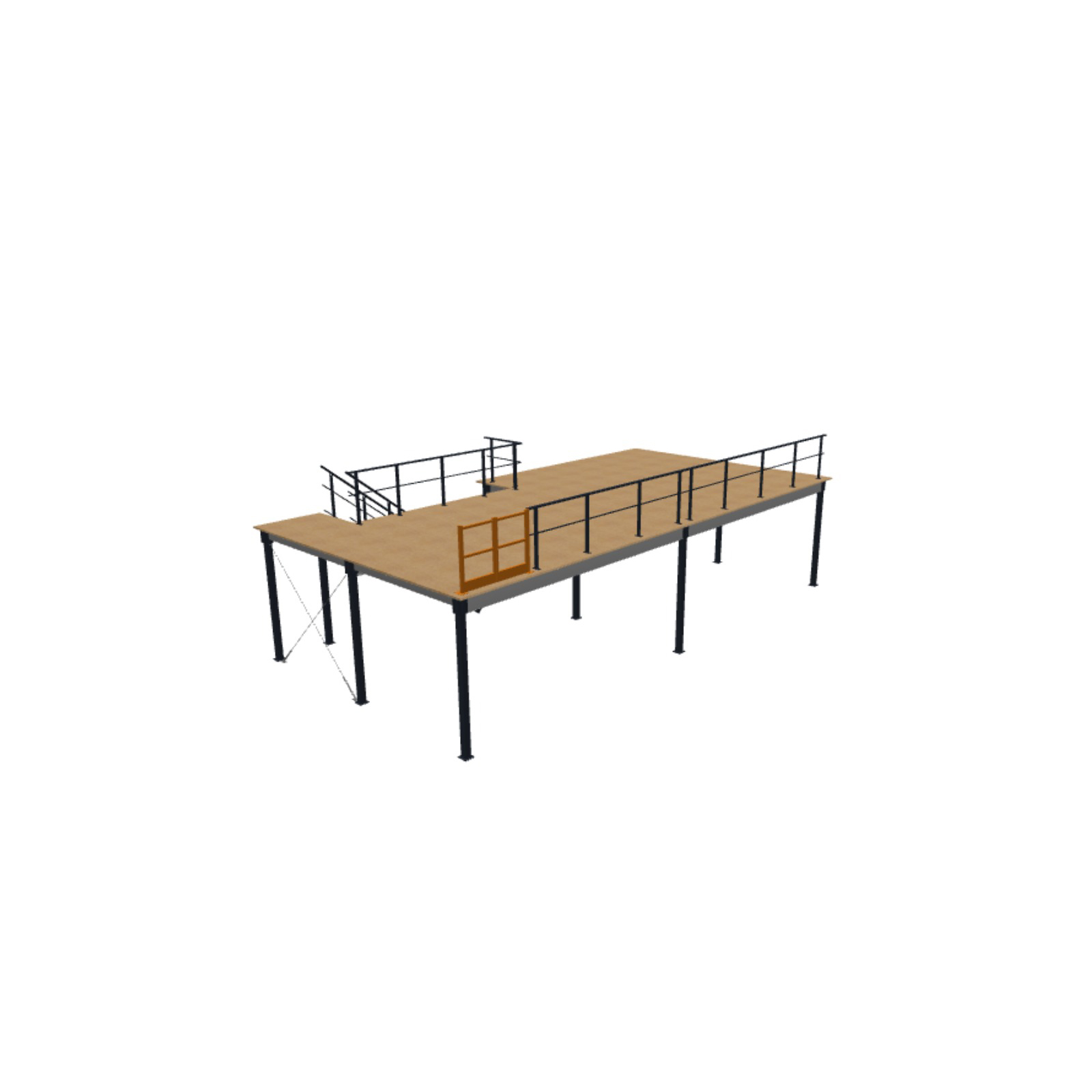 Schody przemysłowe ustawione są pod kątem 38 ° lub 45 ° o wymiarach od 1000 mm. Składają się z 2 stałych szyn i łączeń śrubowych oraz z antypoślizgowej blachy ocynkowanej. Konstrukcja malowana w kolorze RAL 7024/ocynk.