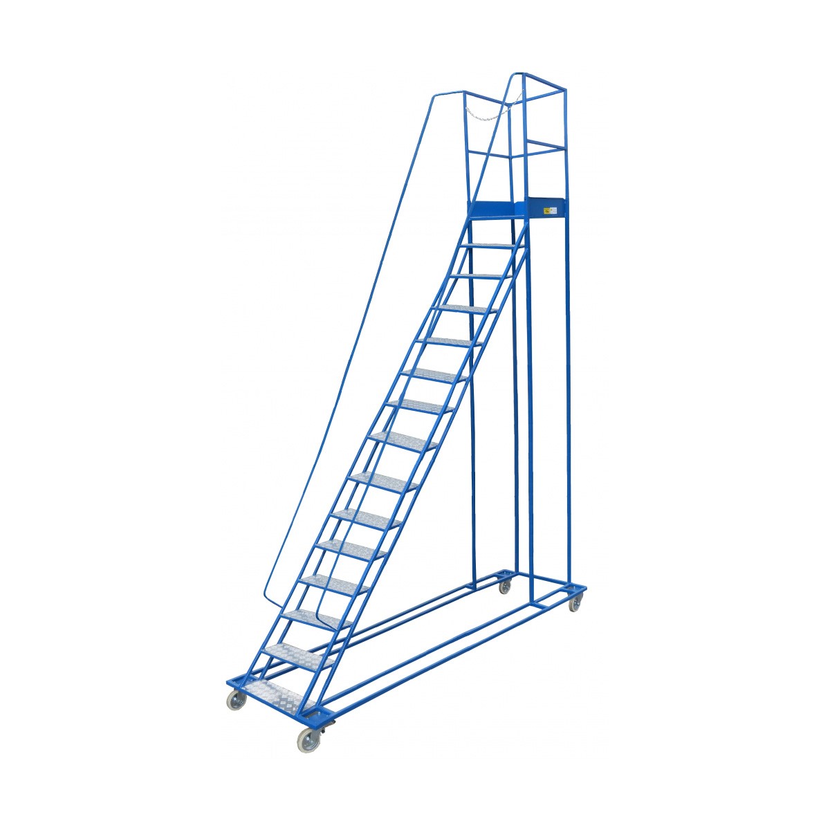 Najwyższa drabina w naszej ofercie. Wyposażona w 14 stopni i obszerny podest, sprawdzi się wyśmienicie w dużych pomieszczeniach służących do przechowywania drobnych towarów. W prosty sposób umożliwia szybki dostęp do zawartości regałów i ich ręczny załadunek.