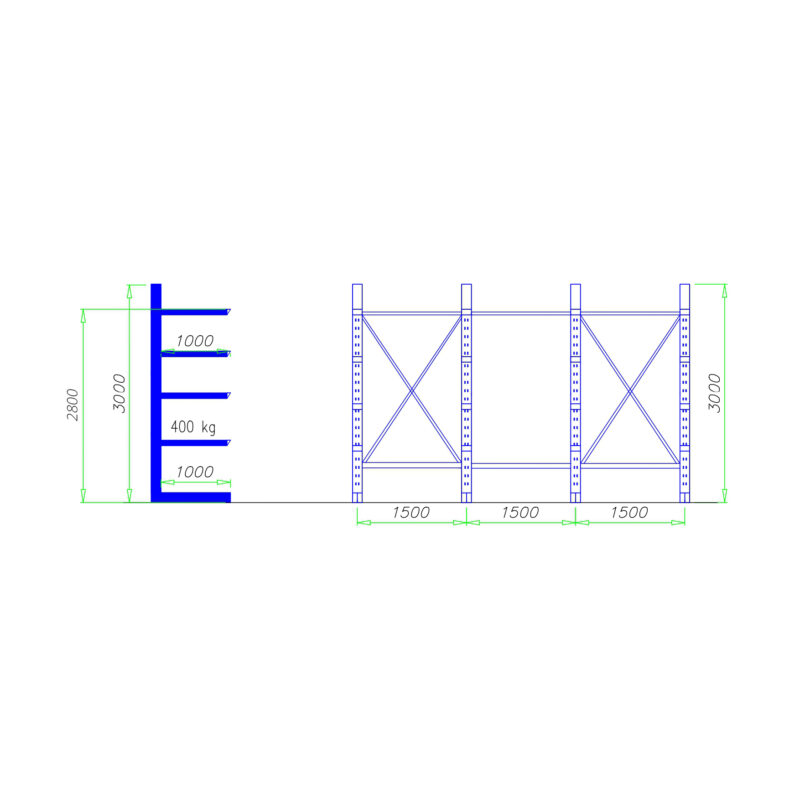 Regał wspornikowy WR7 – L=4500mm – H=3000mm – na poziom 1600kg – 0+4