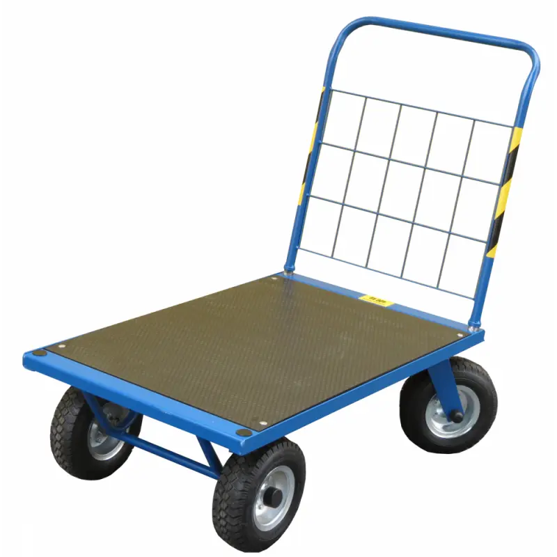Wózek platformowy WP-22 może poruszać się sprawnie po każdym podłożu nawet z pełnym obciążeniem. Zawdzięcza to czterem kołom o średnicy 250 mm – znacznie większym niż w przeciętnym wózku. Dwa z nich są skrętne, zapewniając wysoką manewrowość. O wybieranie nierówności dbają pneumatyczne balonowe opony. Sprawne i wygodne kierowanie jest możliwe dzięki przykręcanemu stalowemu pałąkowi. Metalowa siatka zapobiega przesuwaniu się towarów i zapewnia bezpieczeństwo operatorowi. Całość zabezpieczona jest odpornym lakierem proszkowym w niebieskim kolorze (RAL 5010).